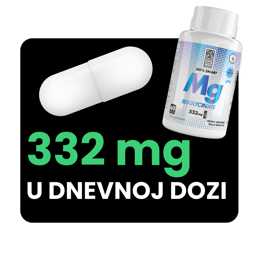 100% Smart Mg Bisglycinate pruža visoko učinkovitu i lako probavljivu formu magnezija s vrhunskom apsorpcijom i dozom od čak 332 mg u samo 1 kapsuli. Pomaže u smanjenju umora, podržava rad mišića i živčanog sustava te doprinosi boljem snu i općem osjećaju ravnoteže organizma.