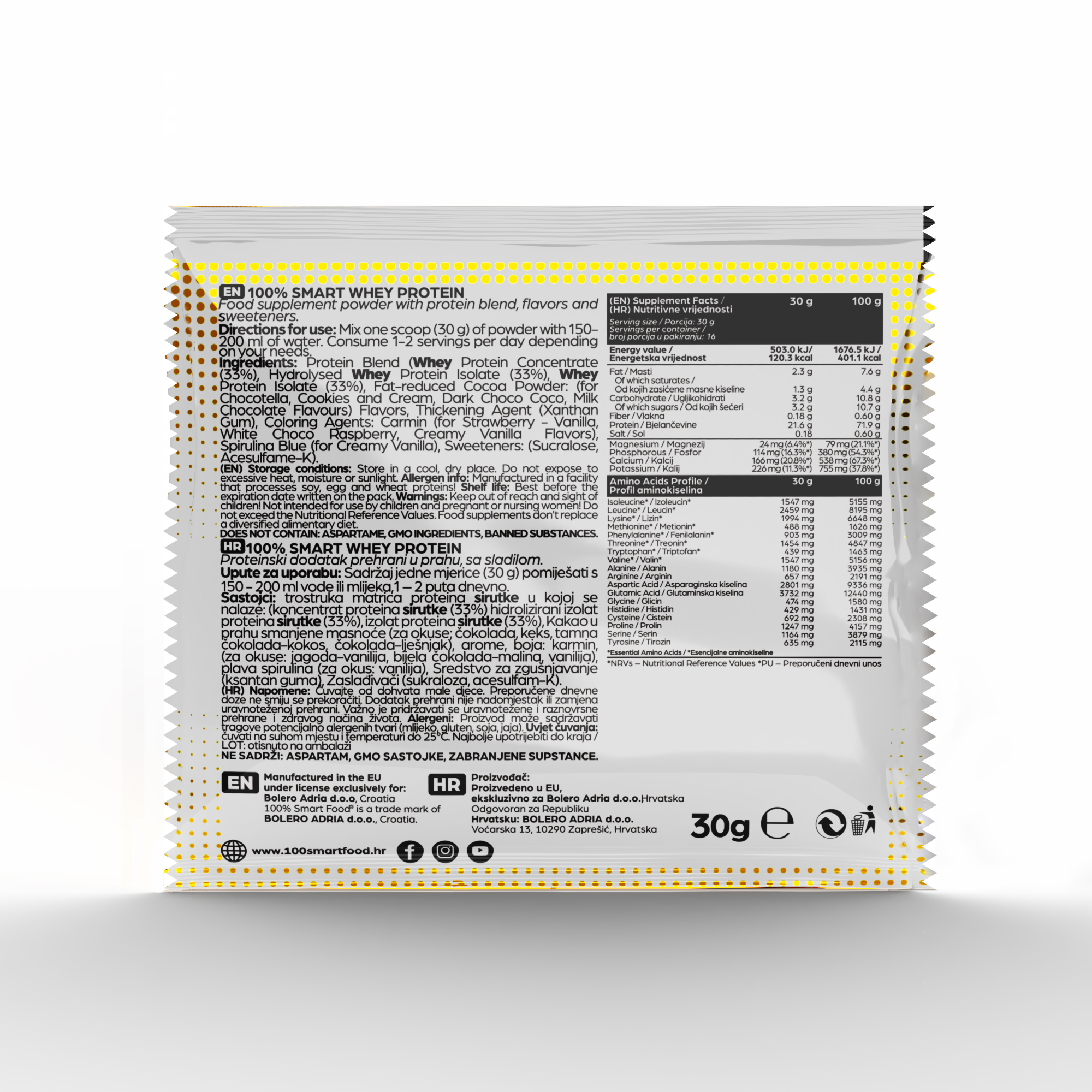 100% Smart Whey Protein nudi savršenu kombinaciju koncentrata, izolata i hidrolizata za brzu apsorpciju, maksimalnu izgradnju mišića i brži oporavak. S visokim udjelom esencijalnih aminokiselina, podržava rast mišićne mase i gubitak masnog tkiva. 100% Smart Whey Protein nije samo za vježbače – pogodan je za sve koji žele podržati svoje zdravlje i aktivan način života.