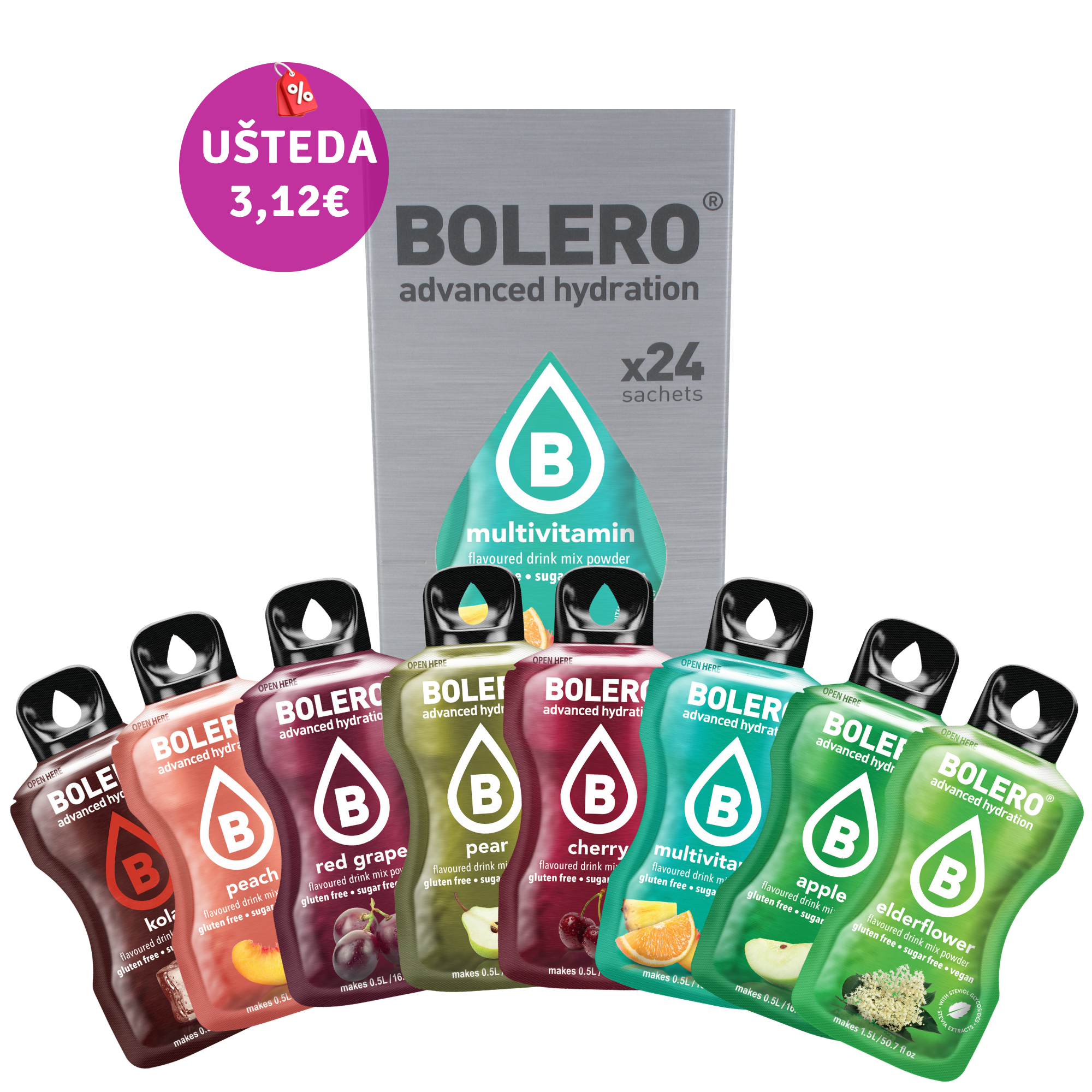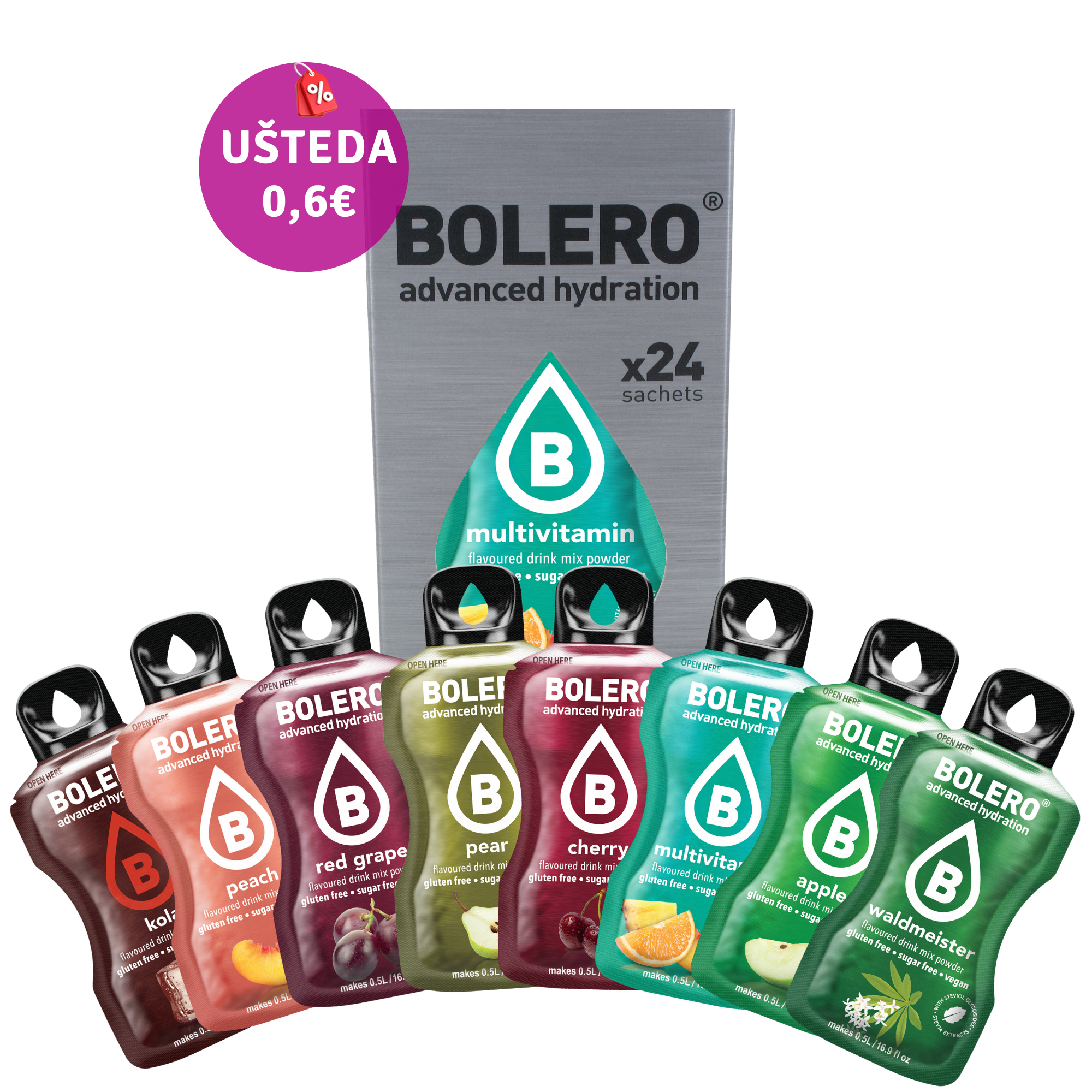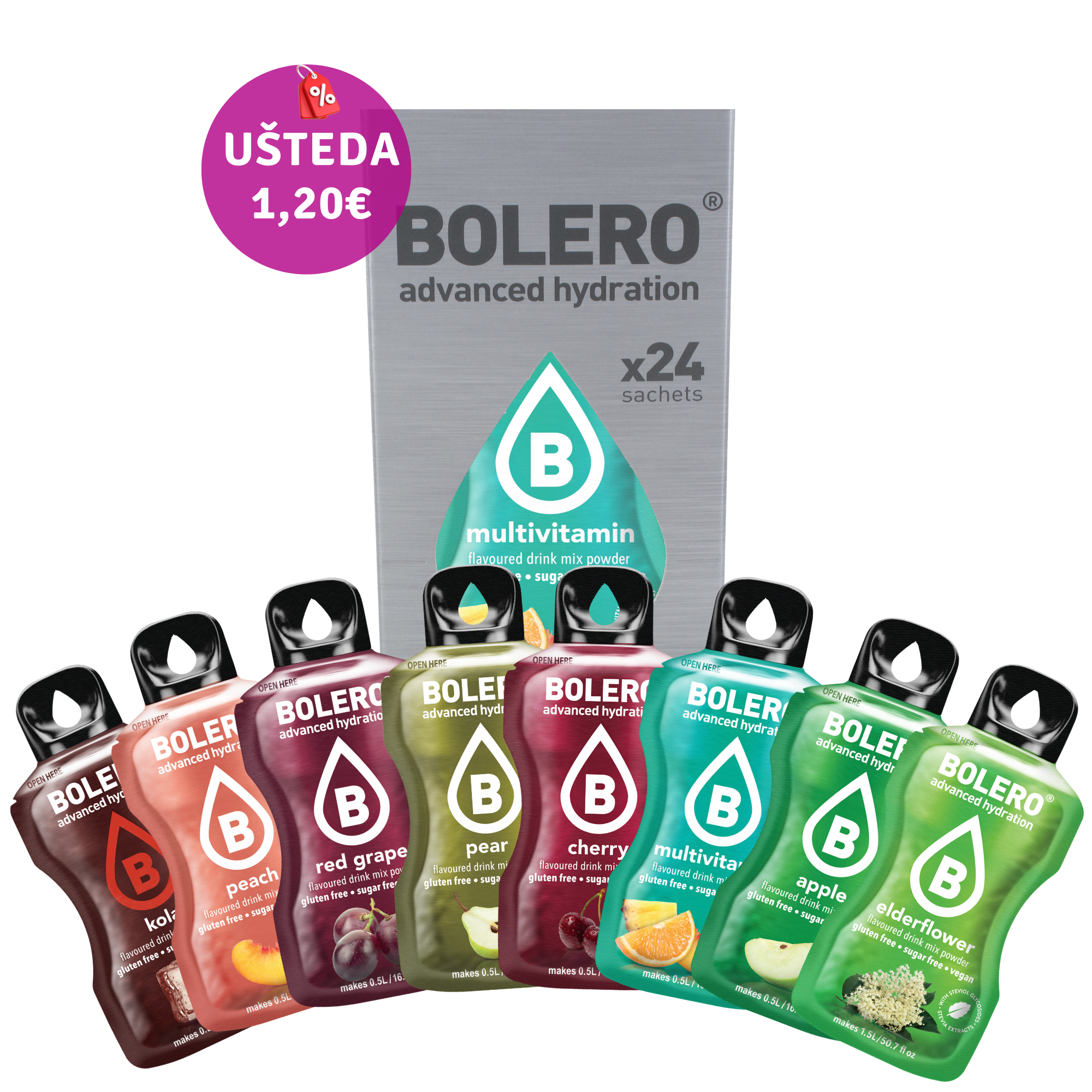 Paket Bolero Classic Mix 24×3 sastoji se od 24 vrećice po 3 grama od kojih je svaka dovoljna za izradu od 500 ml do 1 litre napitka, ovisno o vašoj želji za intenzivnošću okusa. Paket je dovoljan za izradu od 12 do 24 litre napitka, ovisno o vašoj želji za intenzivnošću okusa. Paket se sastoji od 24 vrećice. 8 je okusa po 3 vrećice: 3x Jabuka, 3x Kruška, 3x Cola, 3x Breskva, 3x Multivitamin, 3x Crveno Grožđe, 3x Bazga, 3x Trešnja