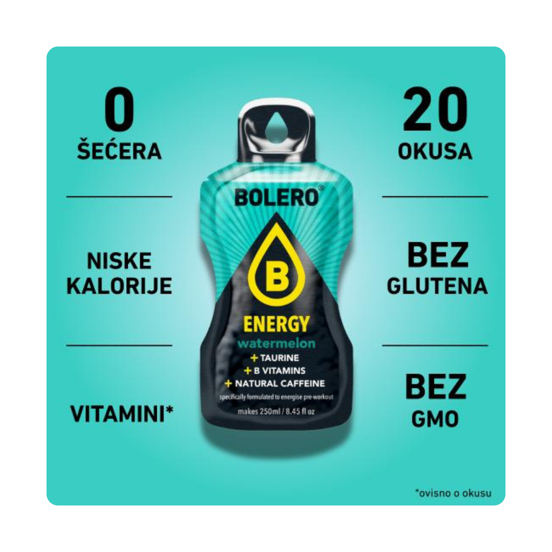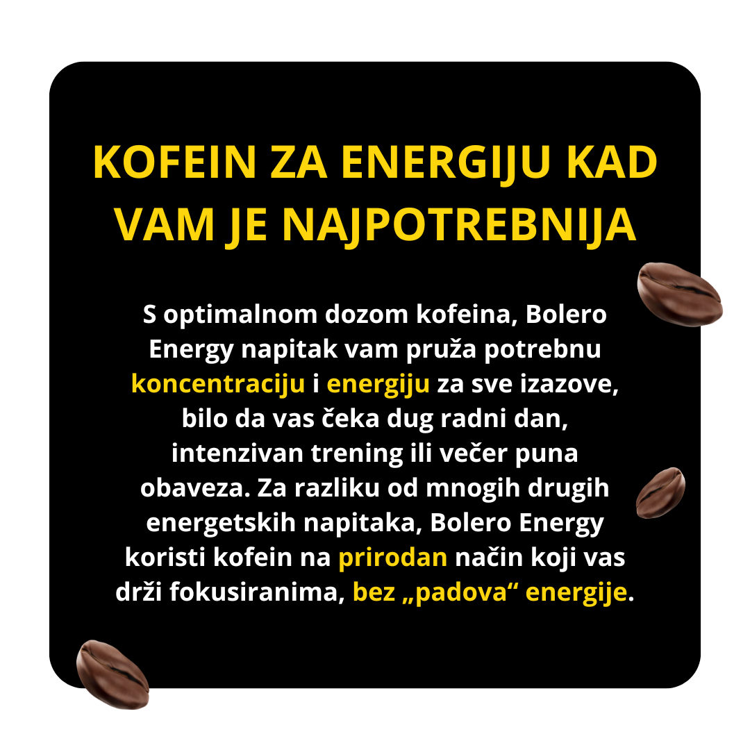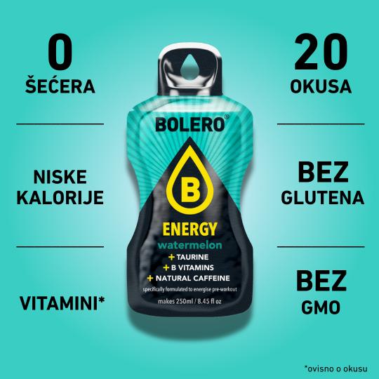 Bolero Energy napitak osmišljen je za sve koji traže čist, prirodan izvor energije, bez neželjenih dodataka. Ovaj napitak je bez šećera, aditiva, konzervansa i bez umjetnih boja i aroma, pružajući vam energiju kakvu trebate - u najčišćem obliku.