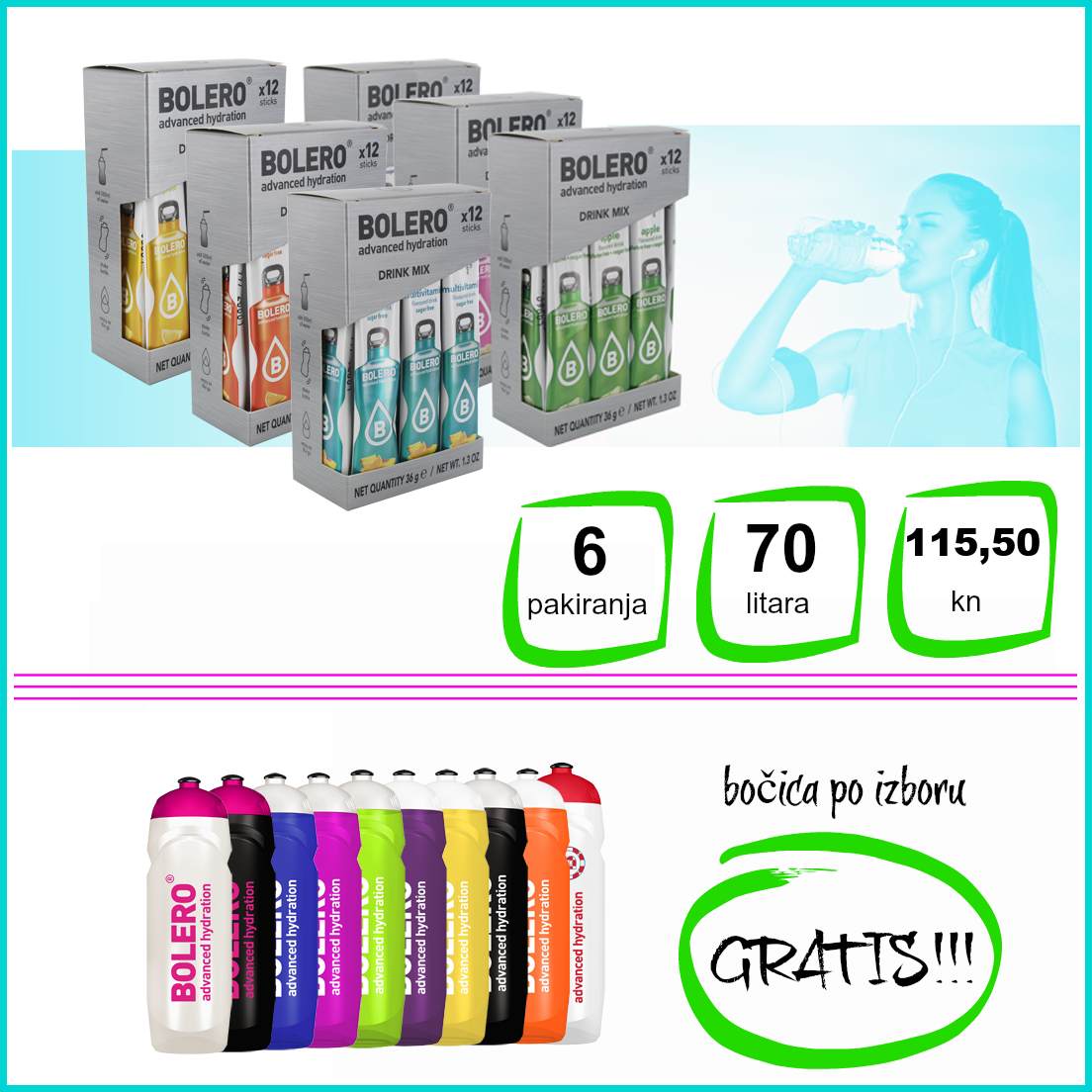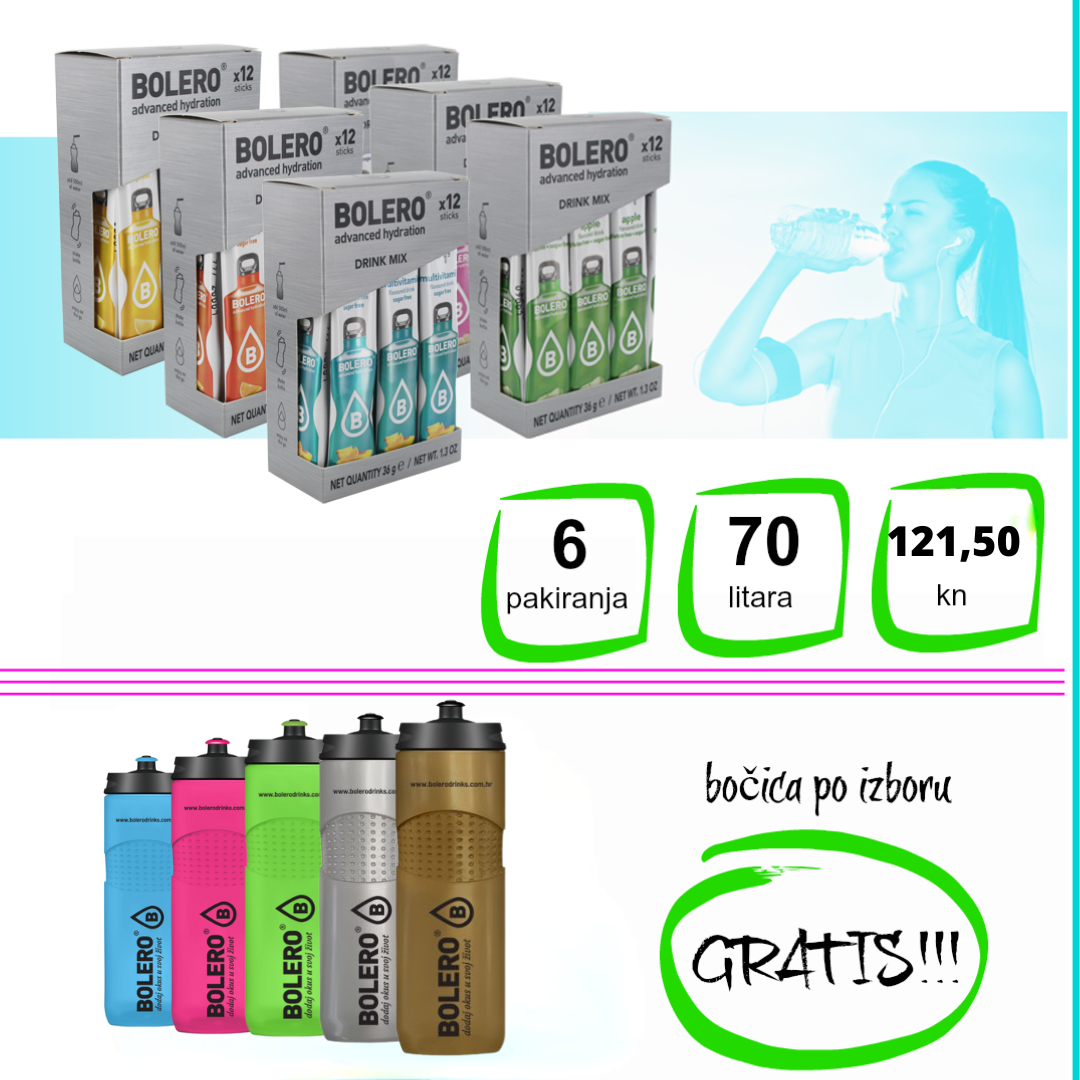 Paket se sastoji od 6 Bolero Sticks okusa po vašem izboru + bočica GRATIS!