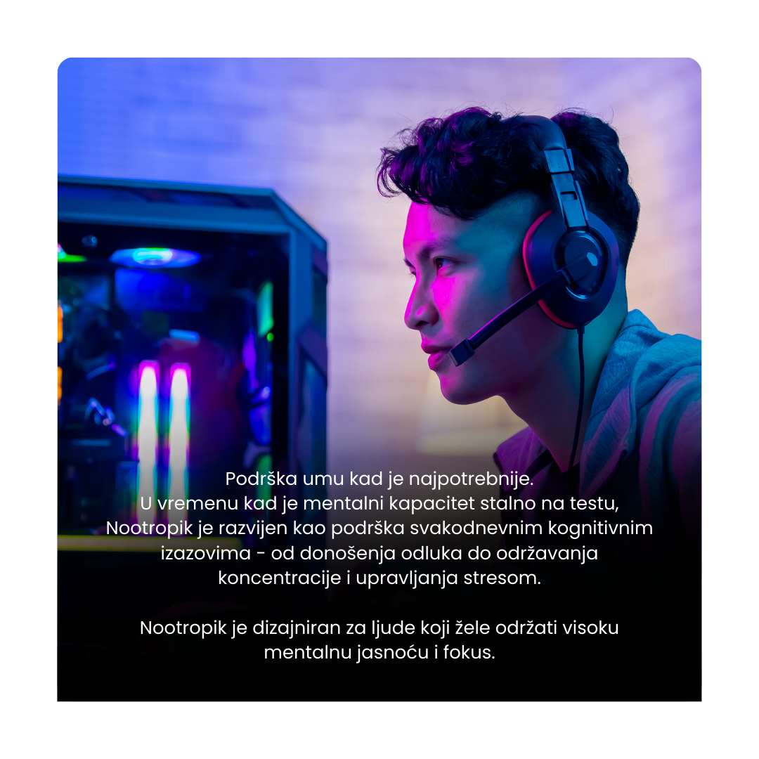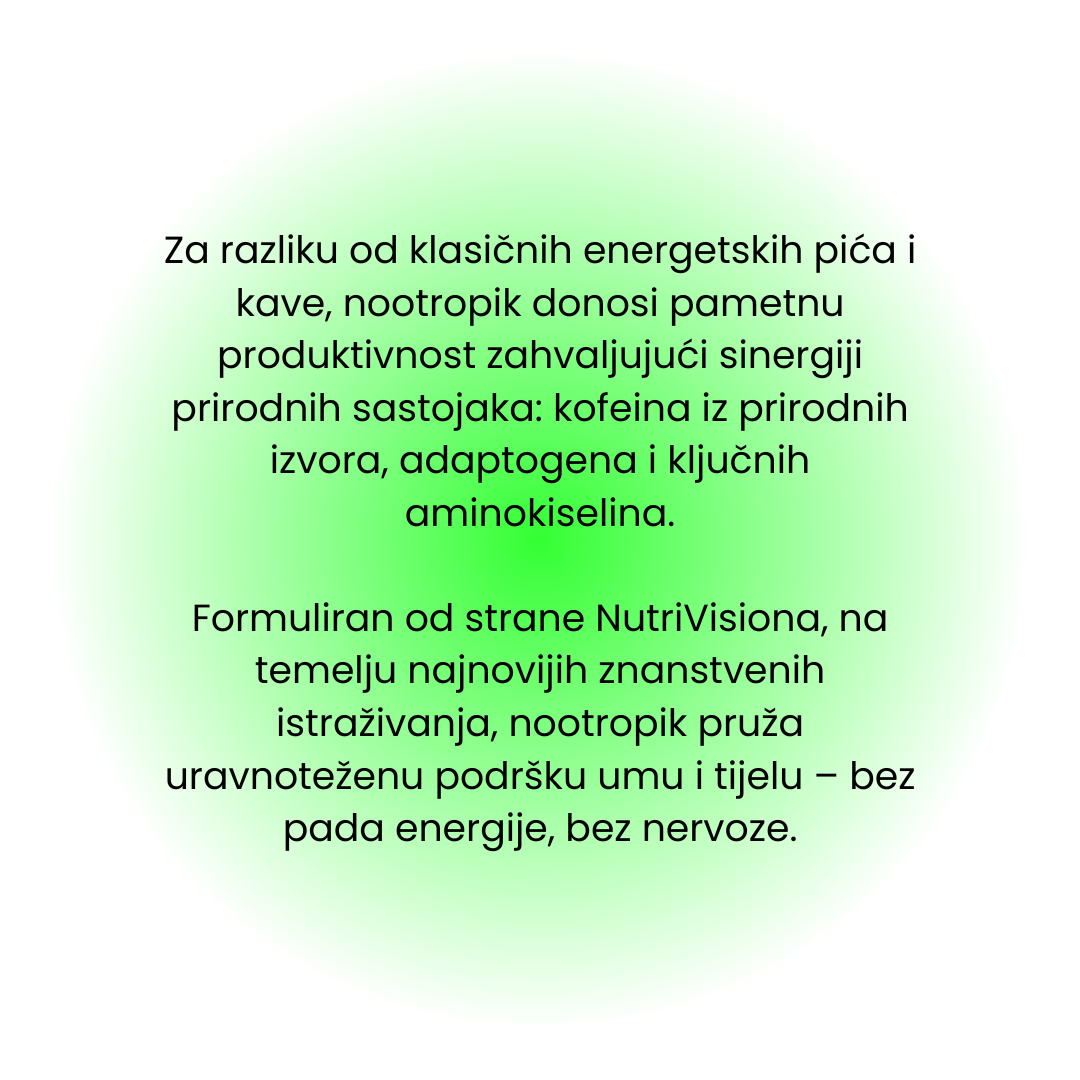 Nootropik koristi nootropne i funkcionalne sastojke koji podržavaju koncentraciju i budnost bez osjećaja nervoze. Ne oslanja se na visoke doze šećera ili agresivne stimulanse, već pruža uravnoteženu i dugotrajniju energiju.