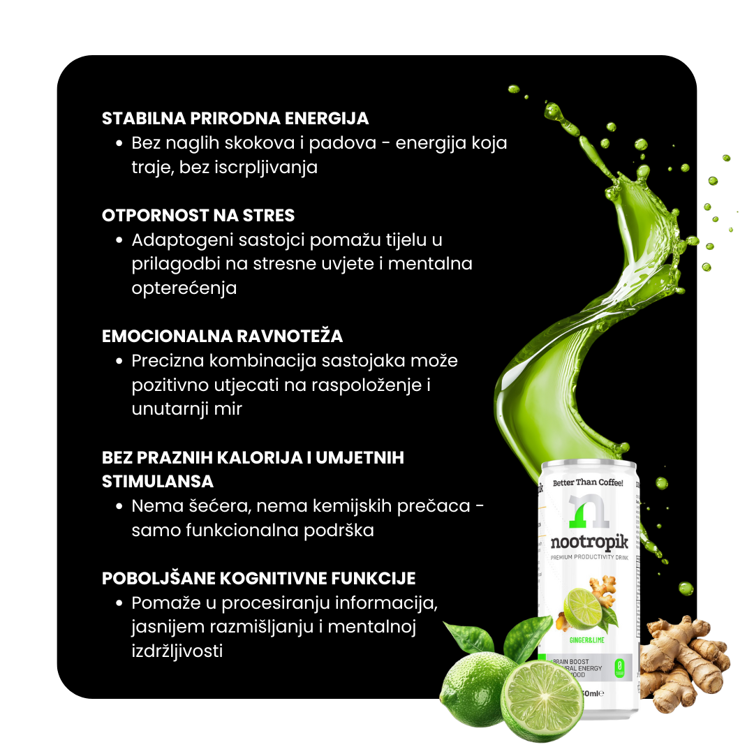 Nootropik Đumbir i Limeta je funkcionalni napitak nove generacije produktivnih pića koja spaja osvježavajući aromatični okus s ciljanom podrškom umu i tijelu.