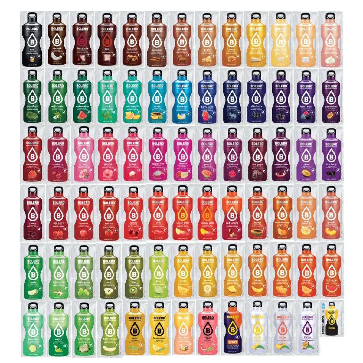 “UPOZNAJ BOLERO” kutija sadrži 74 Classic vrećice po 9 grama za izradu od 1,5 l do 3 l napitka (ovisno o vašoj želji za intenzivnošću okusa), 3 Ice Tea vrećice po 8 grama za izradu od 1,5 l do 3 l napitka (ovisno o vašoj želji za intenzivnošću okusa), 1 Bolero Isotonic vrećicu od 9 grama za izradu od 1,5 l do 3 l napitka (ovisno o vašoj želji za intenzivnošću okusa) i 1 Bolero Energy vrećicu od 7 grama za izradu 250 ml napitka (ovisno o vašoj želji za intenzivnošću okusa). Cijeli paket je dovoljan za izradu od 117 litara i 250 ml do 234 litre i 250 ml napitka.