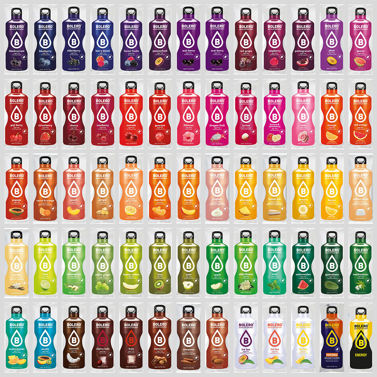 BADEM, JABUKA, ACEROLA, ACAI BOBICE, BANANA JAGODA, BOBIČASTO VOĆE, CRNI RIBIZL, BOROVNICA, BANANA, VIŠNJA, KOKOS, BRUSNICA, VIŠNJA KOLA, MRKVA NARANČA, CIMET, KRASTAVAC, CHILLI, PITAJA, EXOTIC, CVIJET BAZGE, PLOD BAZGE, ŠUMSKO VOĆE, ĐUMBIR, GUANABANA, GUARANA, GUAVA, GOJI BOBICE, GREJP TONIC, SLATKA DINJA, HIBISKUS, MED, KIWI, KOLA, LIMUN, LIČI, LIMETA, LIMUNSKA TRAVA, PITA OD LIMUNA, LIMUNADA, LIMUN CHILLI, LIMUN TONIC, MANDARINA, MANGO, MULTIVITAMIN, MENTA, MOJITO, MANGO CHILLI, NARANČA, PAPAYA, MARAKUJA, BRESKVA, KRUŠKA, ANANAS, NAR, ŠLJIVA, PANNA COTTA, PINA COLADA, MALINA, CRVENO GROŽĐE, RUŽA, CRVENA NARANČA, RUM, RED SANGRIA, JAGODA, TAMARIND, TOMATO, TONIC, VANILIJA, LAZARKINJA, LUBENICA, BIJELO GROŽĐE, ŽUTI GREJP, JOGURT, YUZU, LEDENI ČAJ BRESKVA, LEDENI ČAJ LIMUN, LEDENI ČAJ MARAKUJA, SPORT, ENERGY