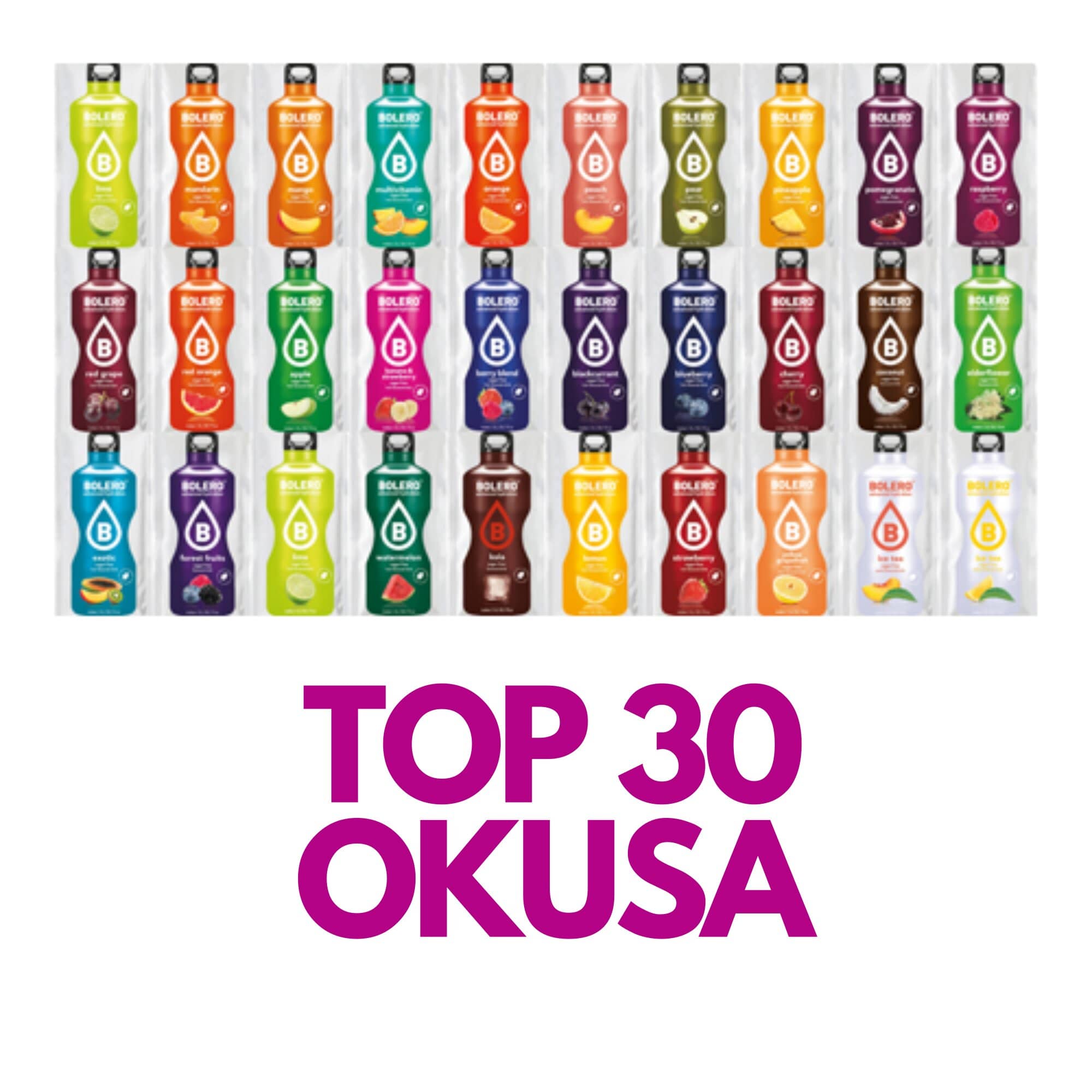 Paket se sastoji od sljedećih okusa: Naranča, Limun, Jagoda, Malina, Ananas, Mandarina, Šumsko voće, Banana – Jagoda, Lubenica, Multivitamin, Bobičasto voće, Limunada, Žuti Grejp, Crni ribiz, Kola, Borovnica, Limeta, Breskva, Bazga, Crveno grožđe, Crvena naranča, Jabuka, Ice Tea Limun, Ice Tea Breskva